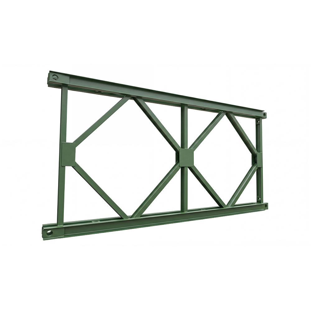 See DetailsThe chord members of the Bailey bridge panels are made of double-section 10# channel steel, and the vertical and diagonal members are made of 8# I-beams. The entire structure is welded to form a "cross" shape, resulting in a stable and reliable structure that is not prone to twisting or deformation. The theoretical load-bearing capacity of the chord members is 560 KN, the theoretical load-bearing capacity of the vertical members is 560 KN, and the theoretical load-bearing capacity of the diagonal members is 171.5 KN. The Bailey bridge panels serve as the main load-bearing components of the entire bridge and are connected by Bailey pins.
